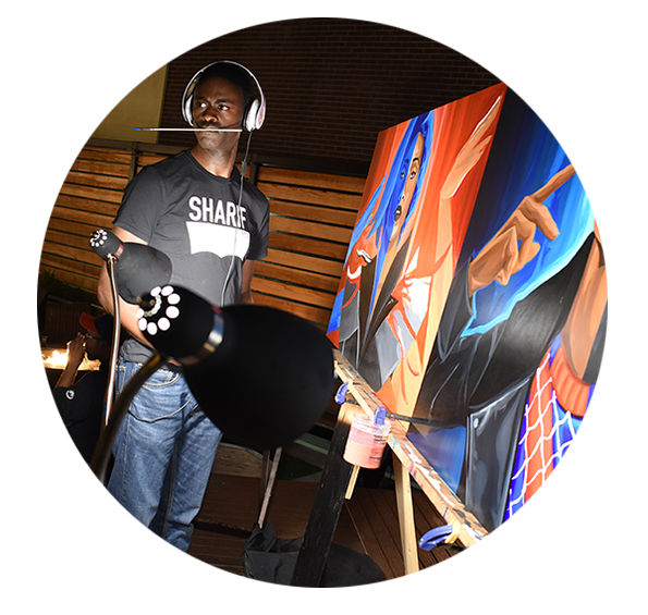 Sharif paints a majority of his work live at nightclubs, bars, or any place where the